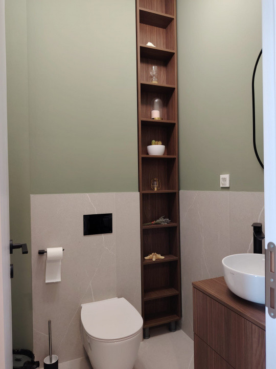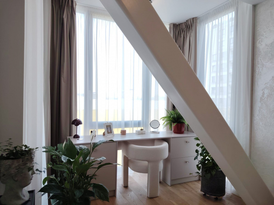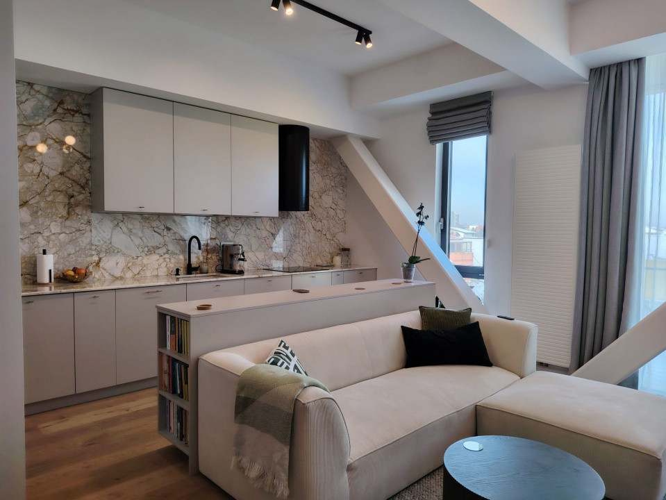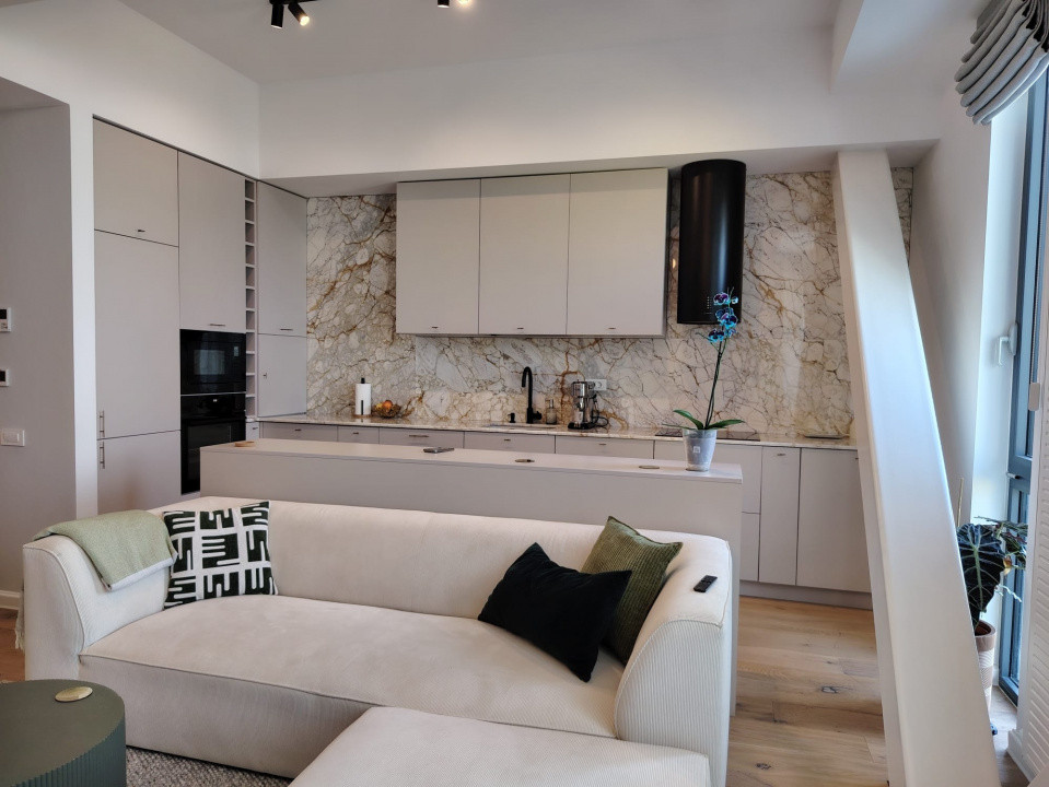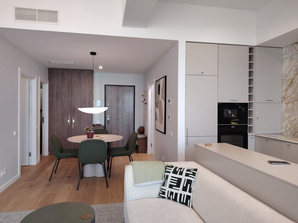 Apartamentul impresionează printr-un design contemporan, elegant, cu finisaje de înaltă calitate și o compartimentare eficientă. Zona de living este amplă și luminoasă, cu bucătărie open-space complet echipată, mobilier realizat la comandă și electrocasnice moderne, integrate armonios într-un spațiu aerisit și funcțional.